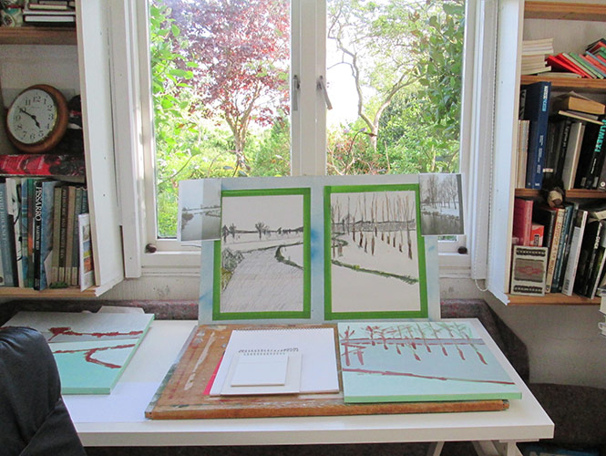 Valerie Lindsell: art studio, landscape sketches with painting in progress on work table, large window overlooking the garden.